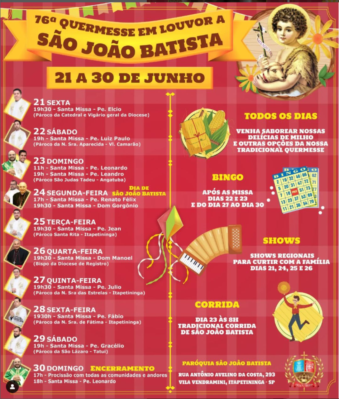 As atividades tradicionais também já têm data como a corrida de São João Batista no dia 23 as 8h e o famoso bingo que vai acontecer após as missas dos dias 22 e 23 e dos dias 27 a 30.